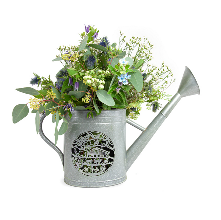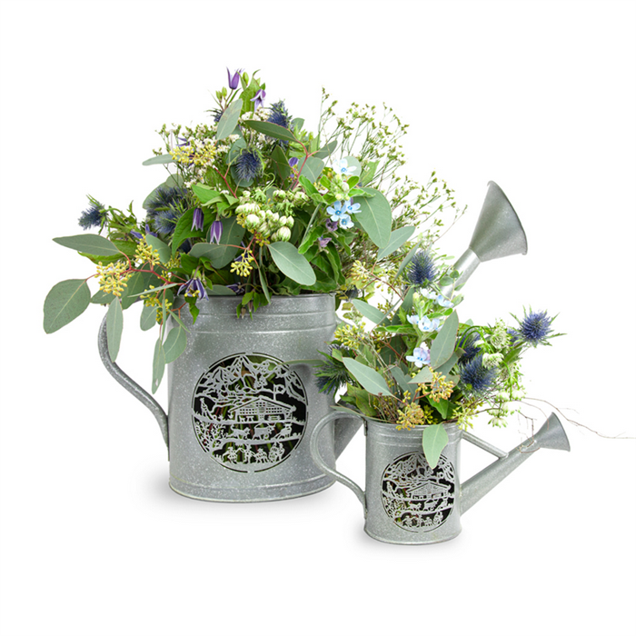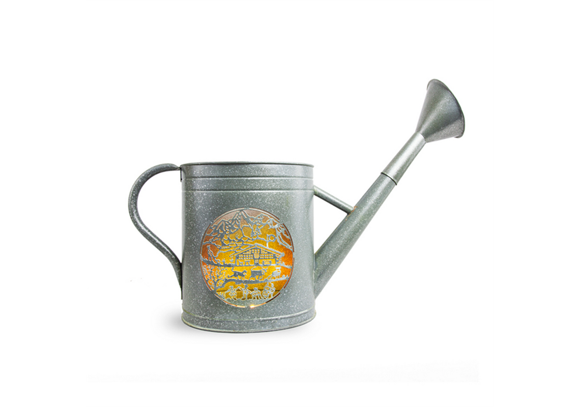 Die antiken Giesskannen gehen bis auf anfangs des 18. Jahrhunderts zurück und freuen sich seit je her grosser Beliebtheit in Schweizer Gärten. Die liebevoll kreierten Produkte lassen sich einerseits perfekt mit einem Blumen-Bouquet inszenieren oder in den Abendstunden mit Kerzen angenehm ausleuchten. ¬´Giardina Alpina¬ª ist mit einem Scherenschnitt von Esther Gerber entstanden.