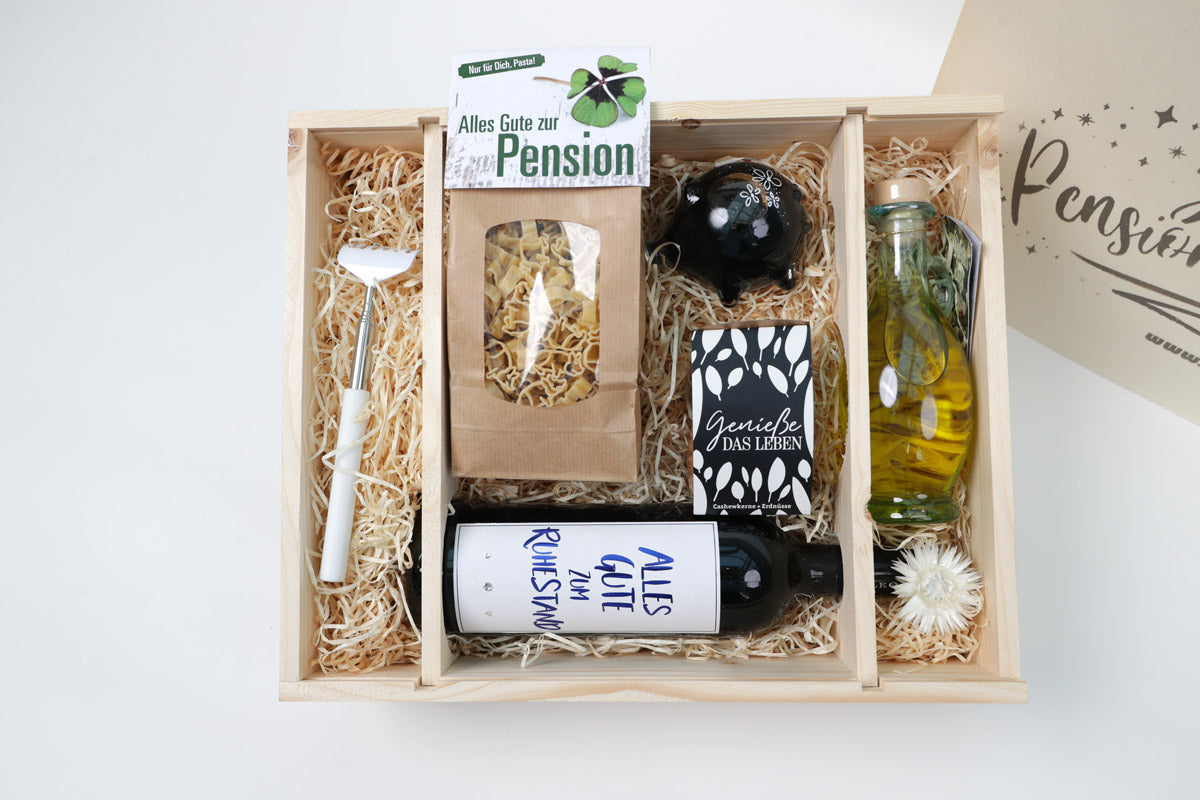 Die Geschenkbox "zur Pensionierung" enthält folgende Artikel: