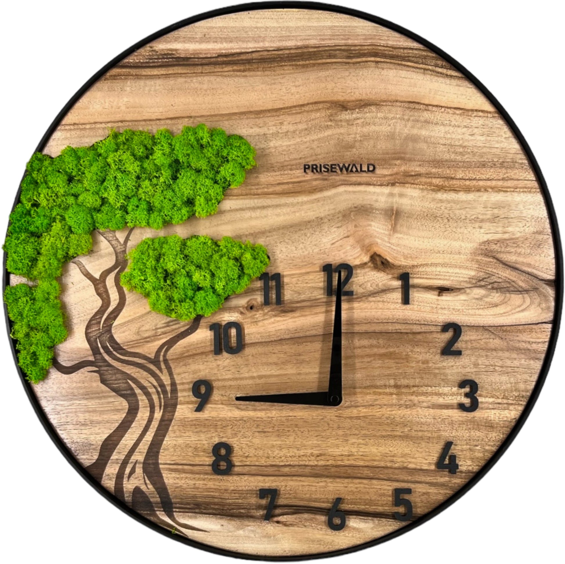 Runde Wanduhr aus Walnussholz, 50 cm, schwarzer Rahmen, arabische Ziffern, Baumgravur mit Moos